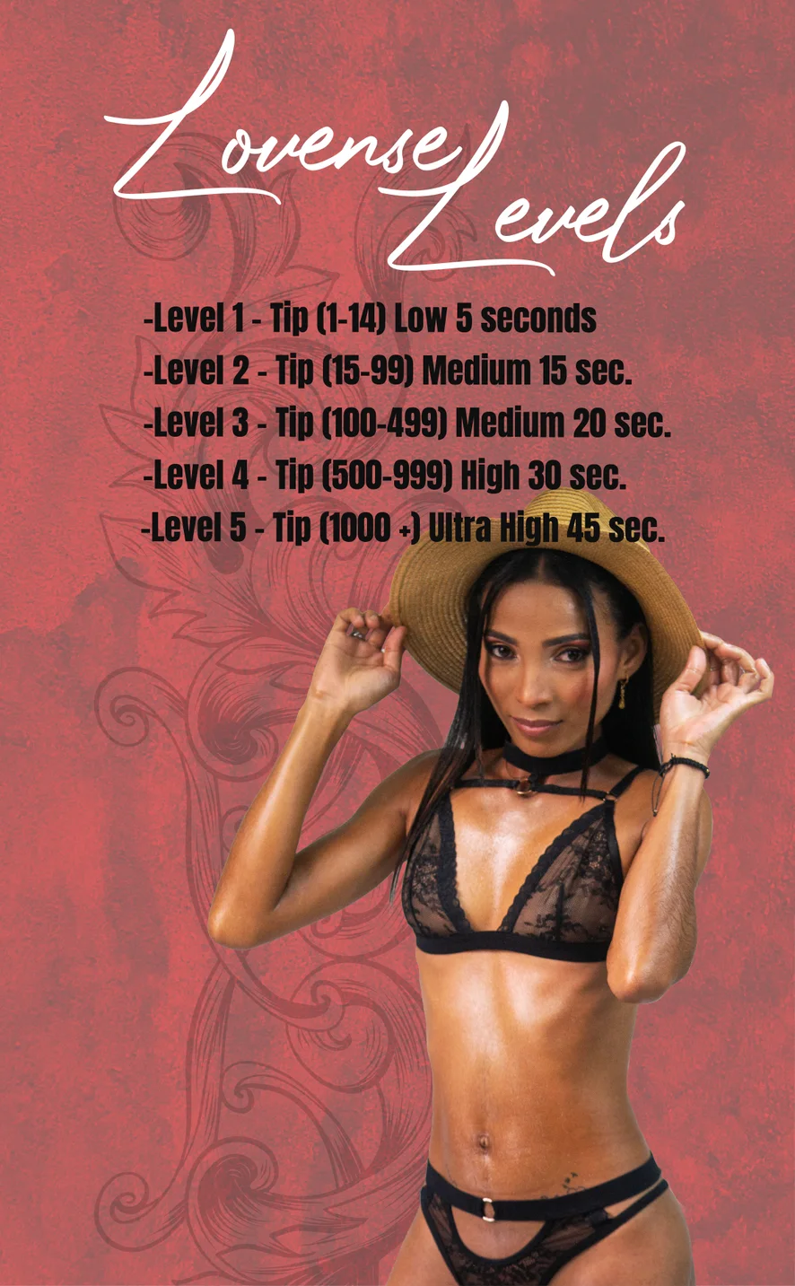 Doggy style, Oljeshow, Striptease, Sexleksaker, Nylon, Erotisk dans, Dildo eller Vibrator, Förnedring, Onani, Avsugning, Orgasm, Smiskning, Spruta